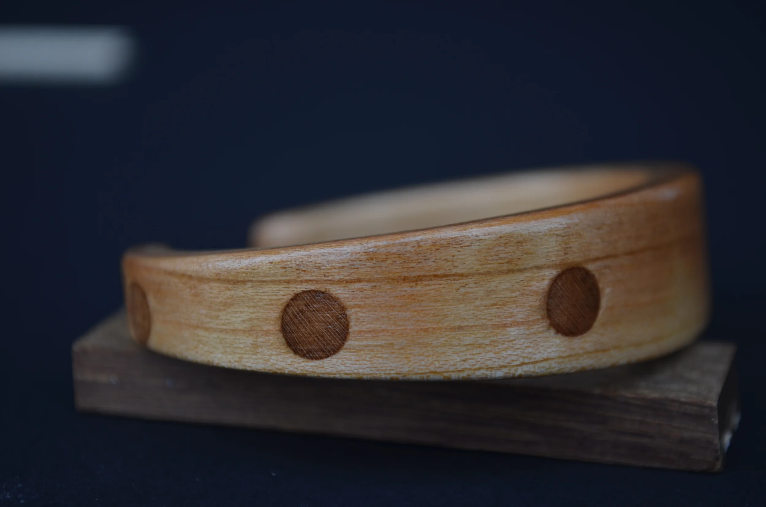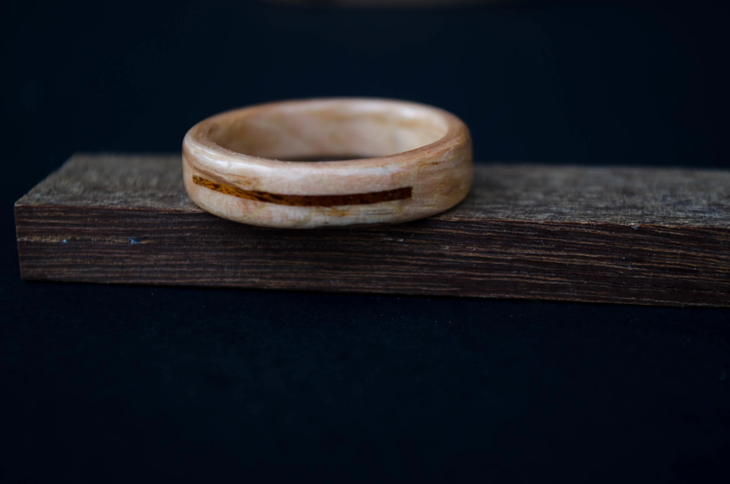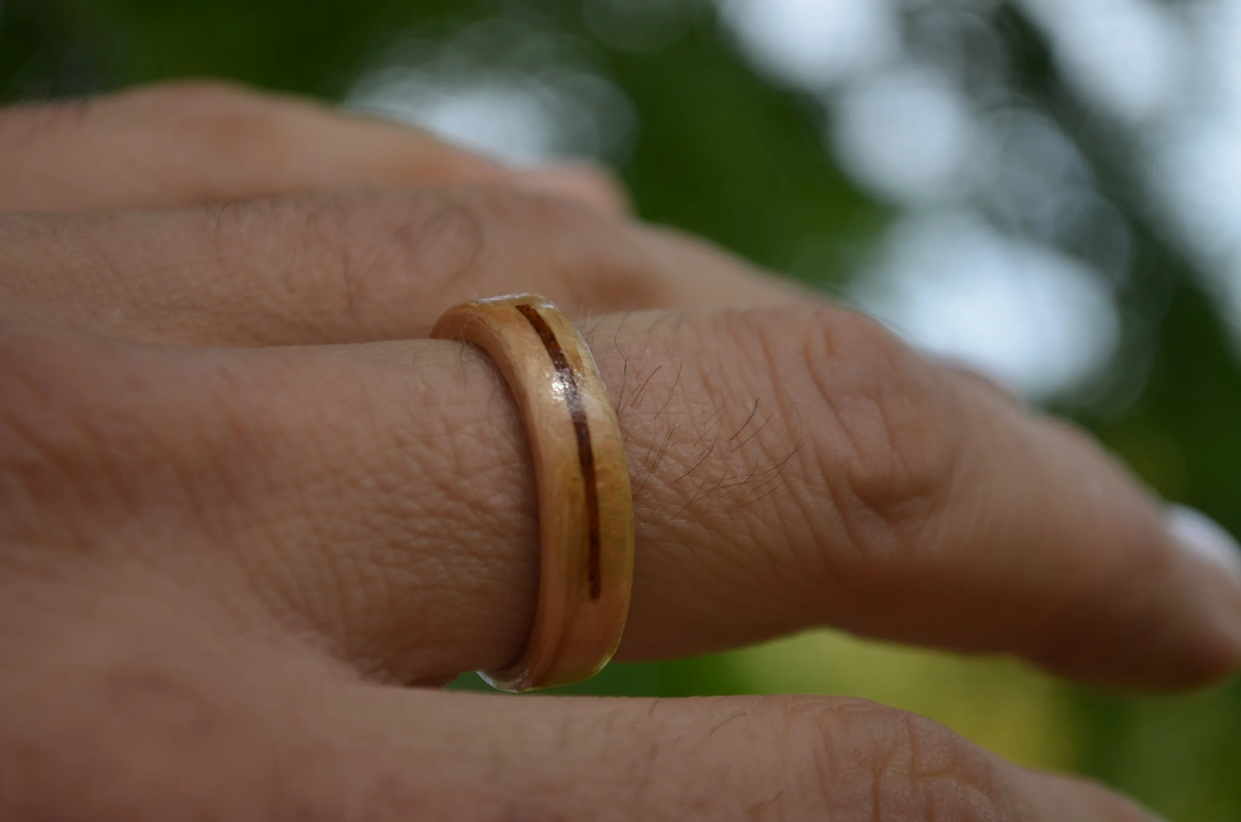 Men's ring. Constructed using a bentwood technique, meaning grains of the wood are parallel to each other. It is extremely strong and durable, finished with lacquer (a hard finish). Oak, inlayed with mahogany