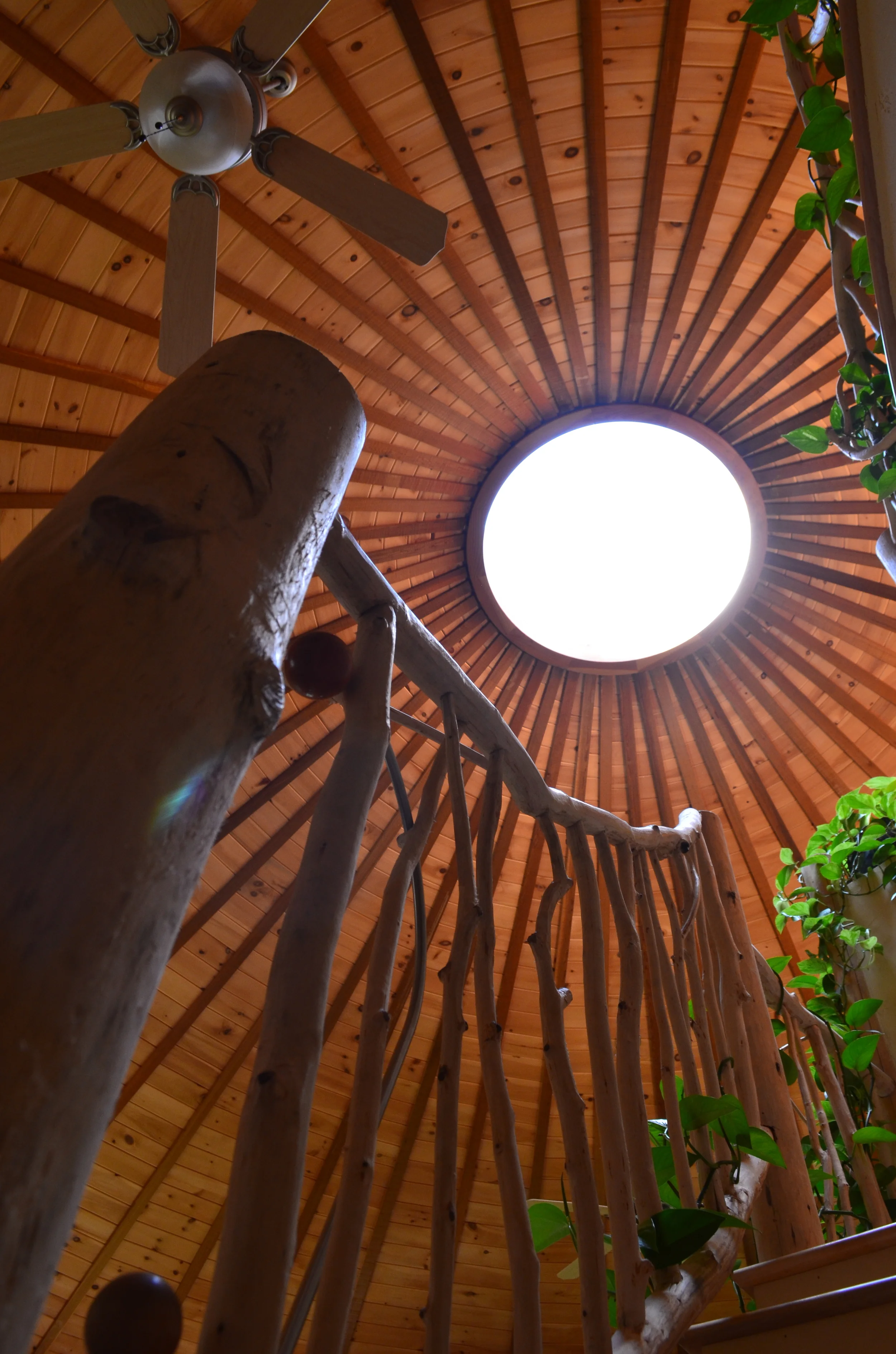 Log handrail using trees cleared from the home's footprint and the operational 3-ply skylight with converging ceiling. Over 2,000 individual tongue and groove white pine pieces were tapered to fit in-between the rafters