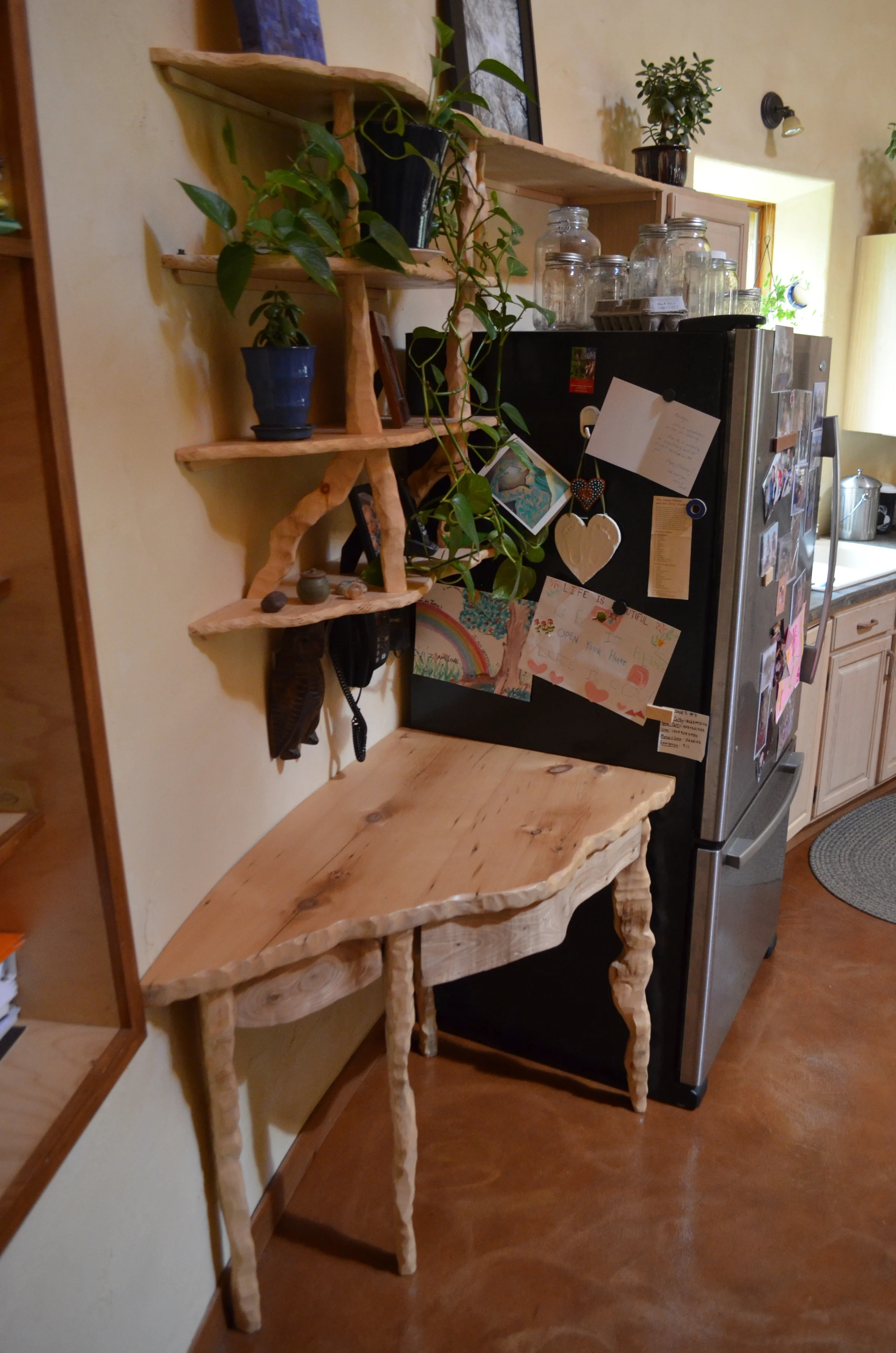 Desk featured on home page. Note the shape and character of this wild piece. The shelving followed this theme too and connects to the kitchen cabinets