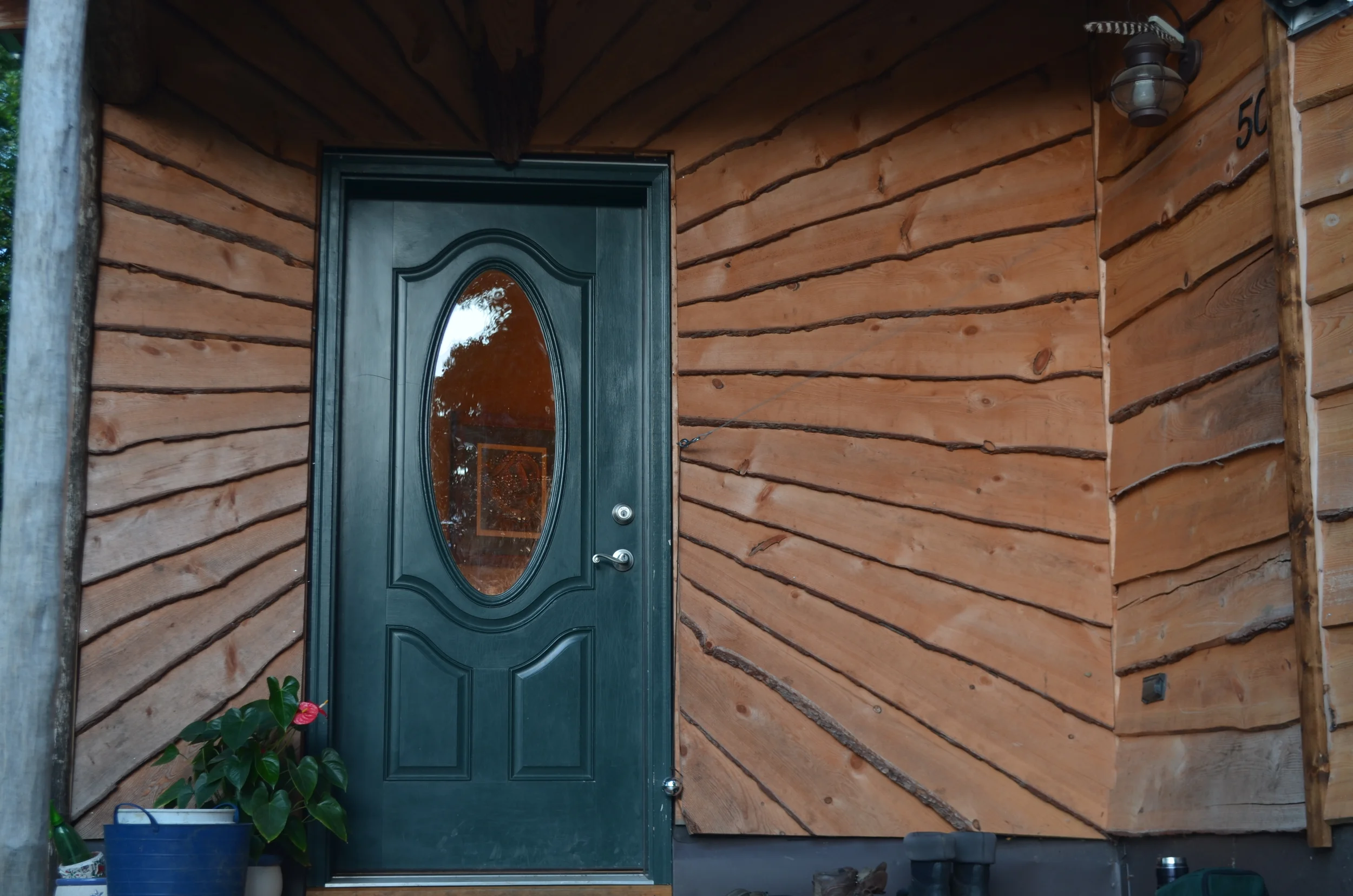 Front door. The siding is live-edge hemlock from Wolcott, VT. Like much of my work, this sun-burst design just happened