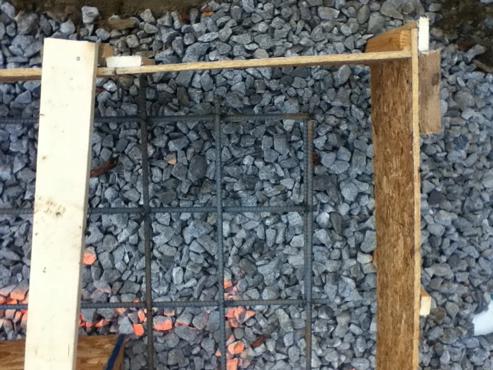 Foundation made with dry-stacked interlocked cinder blocks. Each hollow has rebar and poured concrete, solidifying a base for the structure
