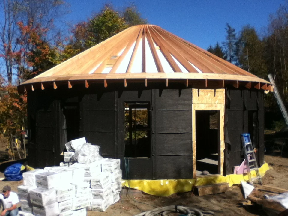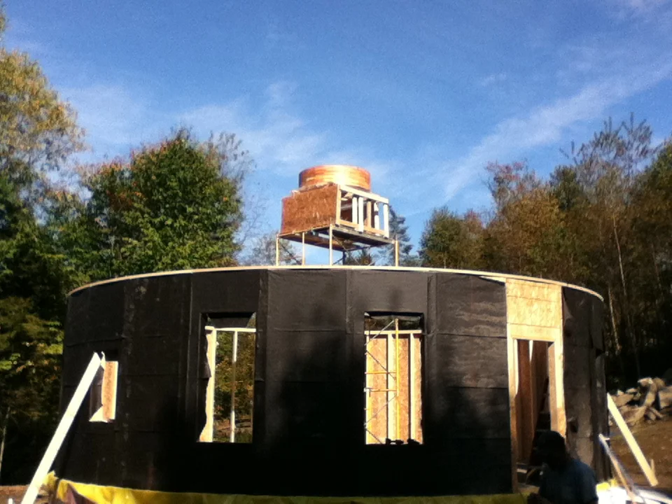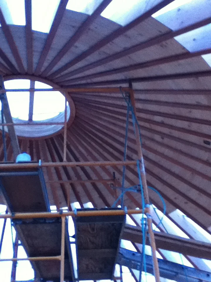 Kind of Death Star looking right here, over 2,000 piece of tongue + grove white pine make the ceiling and hold the insulation