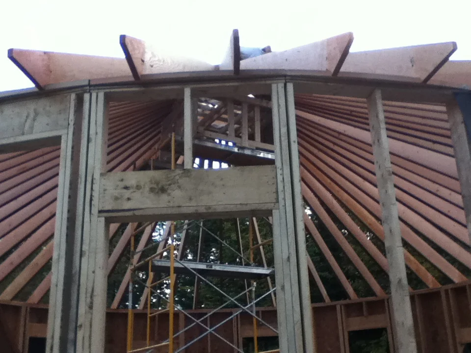 First four rafters, only 50 more to go. They are bare on the central ring, which spreads the weight evenly