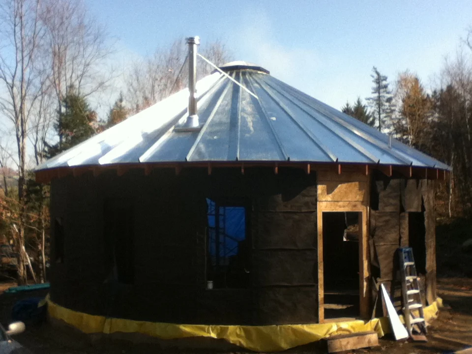 View from the future outdoor shower area. The little canvas yurt echoes the big one. It is used as an office and guest room