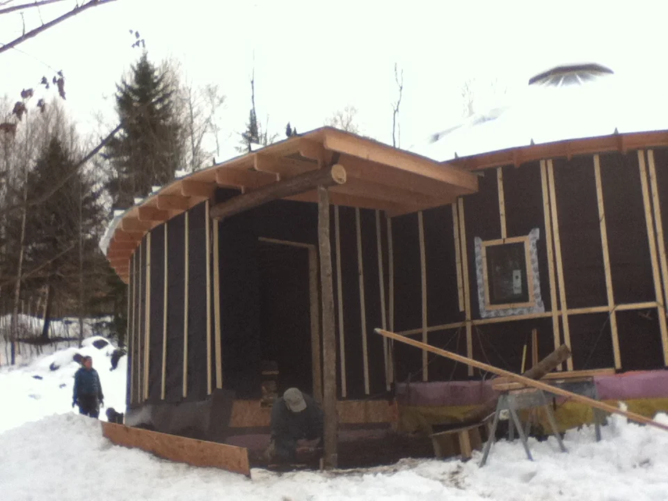 Window are in and the entry is shaping up. Logs cleared from the footprint were used to support the front porch. Strapping is attached as an air gap between the siding and the house