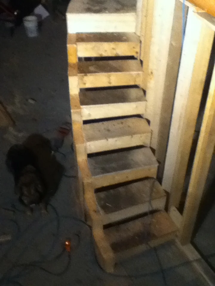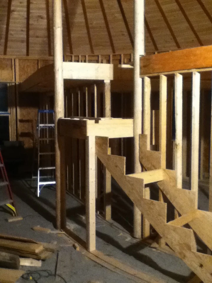 More framing. A bedroom is beyond the stairs seen, a bathroom to the right of them, and a loft is above. The post exiting the pic are again trees from the original footprint