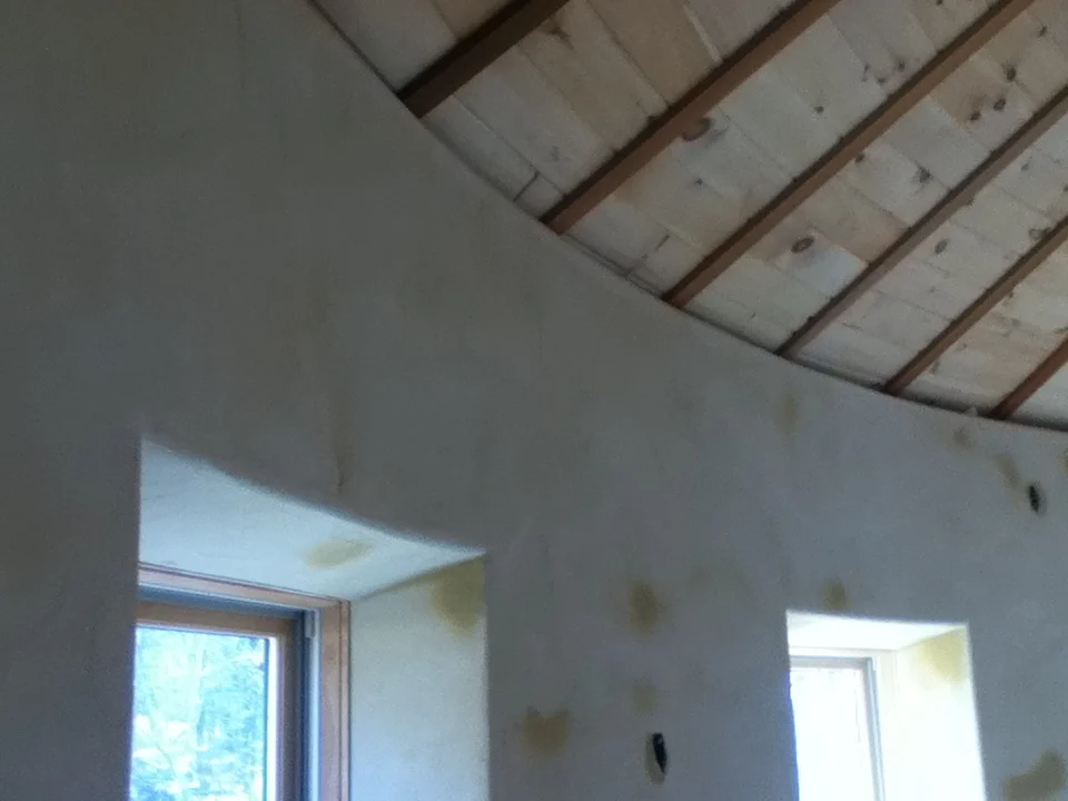 Plaster (drying) and windows and ceiling. Although subtle the window openings are flared 15 degrees on the sides and top between the two layers of framing. This allows more light and more view ability from various angles
